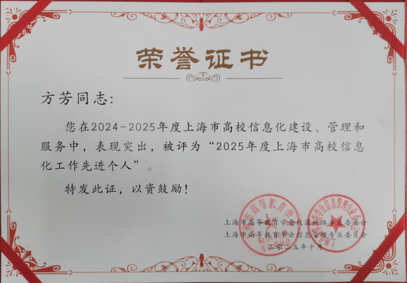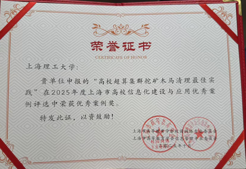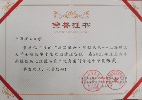 我校申报的“虚实融合·智创未来——上海理工大学全域数字孪生校园建设实践”案例荣获“2025年度上海市高校信息化建设与应用优秀案例银奖”, “高校超算集群挖矿木马清理最佳实践”案例荣获优秀案例奖,方芳老师被评为“2025年度上海市高校信息化工作先进个人”。